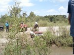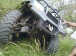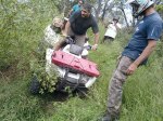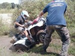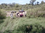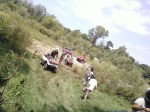 Sendero peligroso, de lo bien que íbamos, entre un huella y un desnivel muy pronunciado desaparecimos del camino y aterrizamos con éxito en los matorrales, que momento,  no nos dimos vuelta ni nada por el estilo, la rueda delantera izq. se levanto y cuando bajó el piso estaba mas abajo de lo pensado, en ese momento acelere para continuar con la inercia y descendimos al borde del río, lo mas lindo era ver bajar a todos los demás, creo que fue la mejor prueba de la tarde.