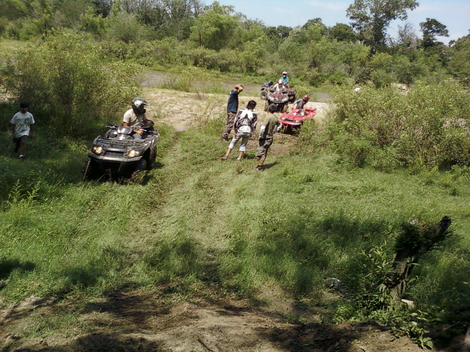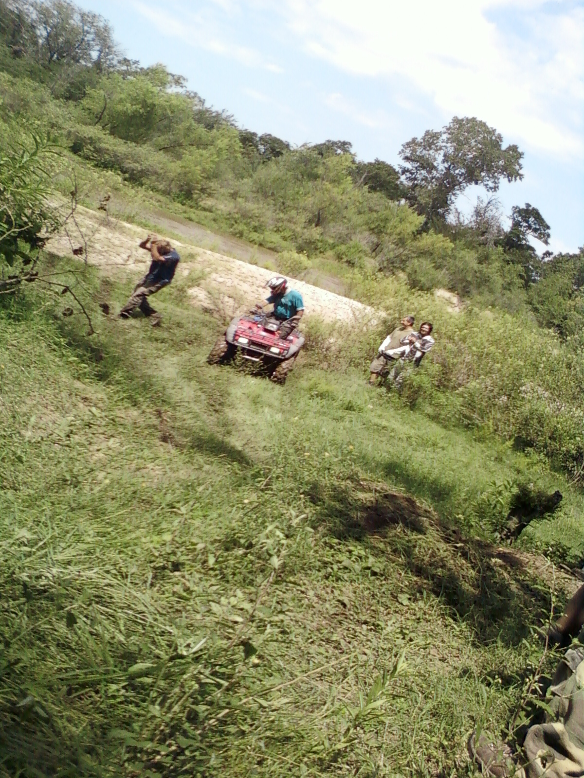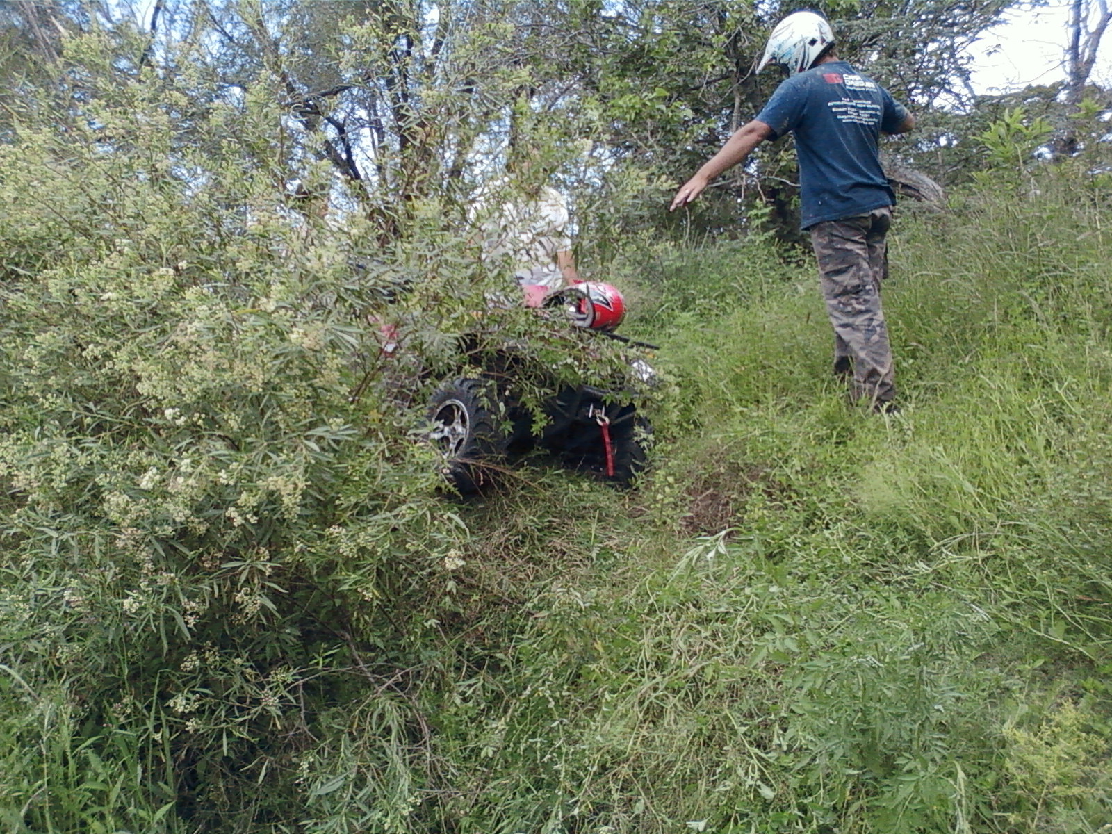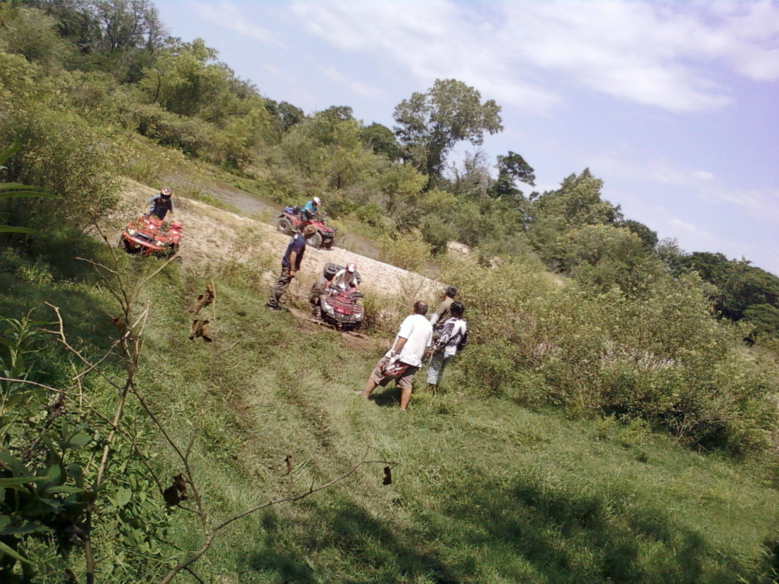 Sendero peligroso, de lo bien que íbamos, entre un huella y un desnivel muy pronunciado desaparecimos del camino y aterrizamos con éxito en los matorrales, que momento,  no nos dimos vuelta ni nada por el estilo, la rueda delantera izq. se levanto y cuando bajó el piso estaba mas abajo de lo pensado, en ese momento acelere para continuar con la inercia y descendimos al borde del río, lo mas lindo era ver bajar a todos los demás, creo que fue la mejor prueba de la tarde.