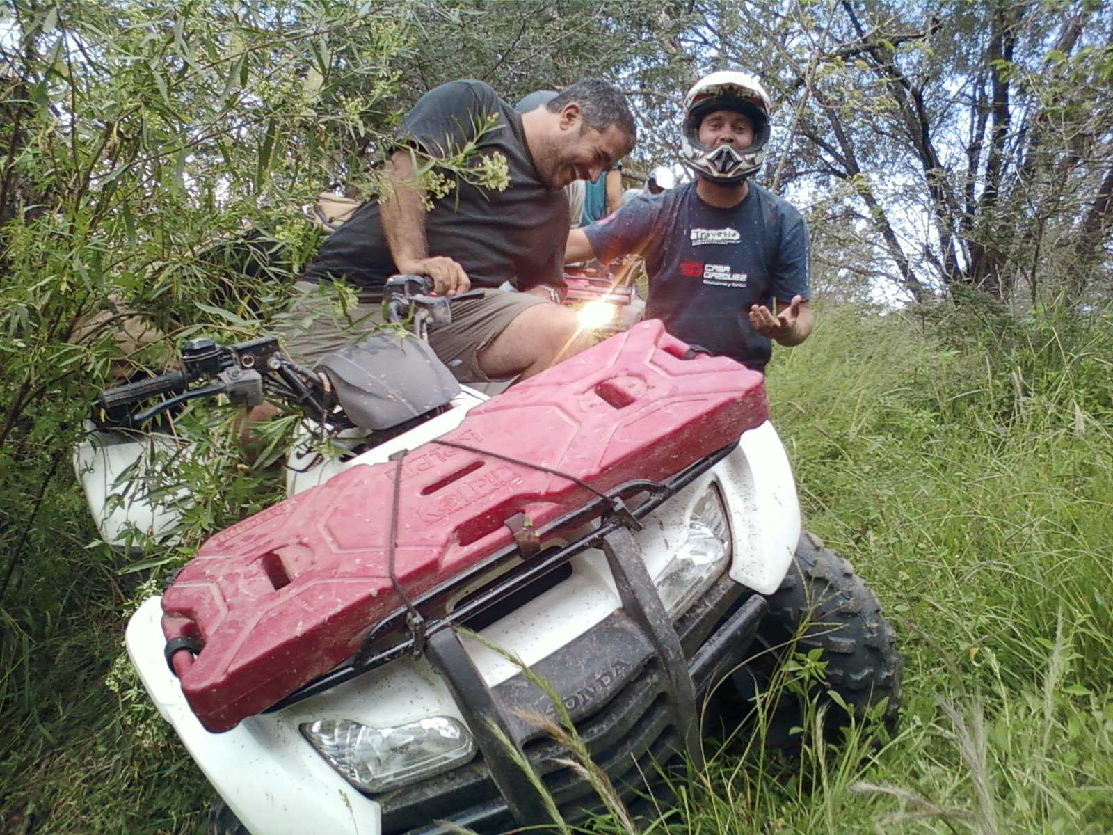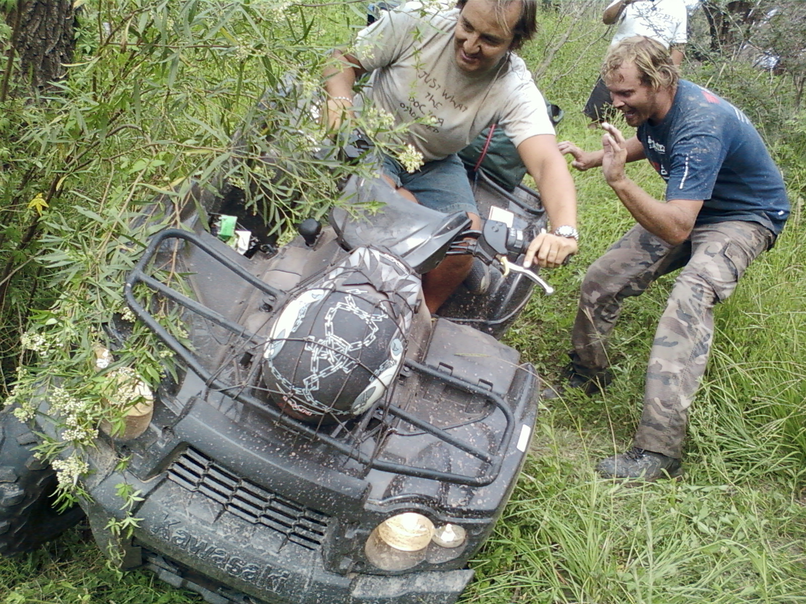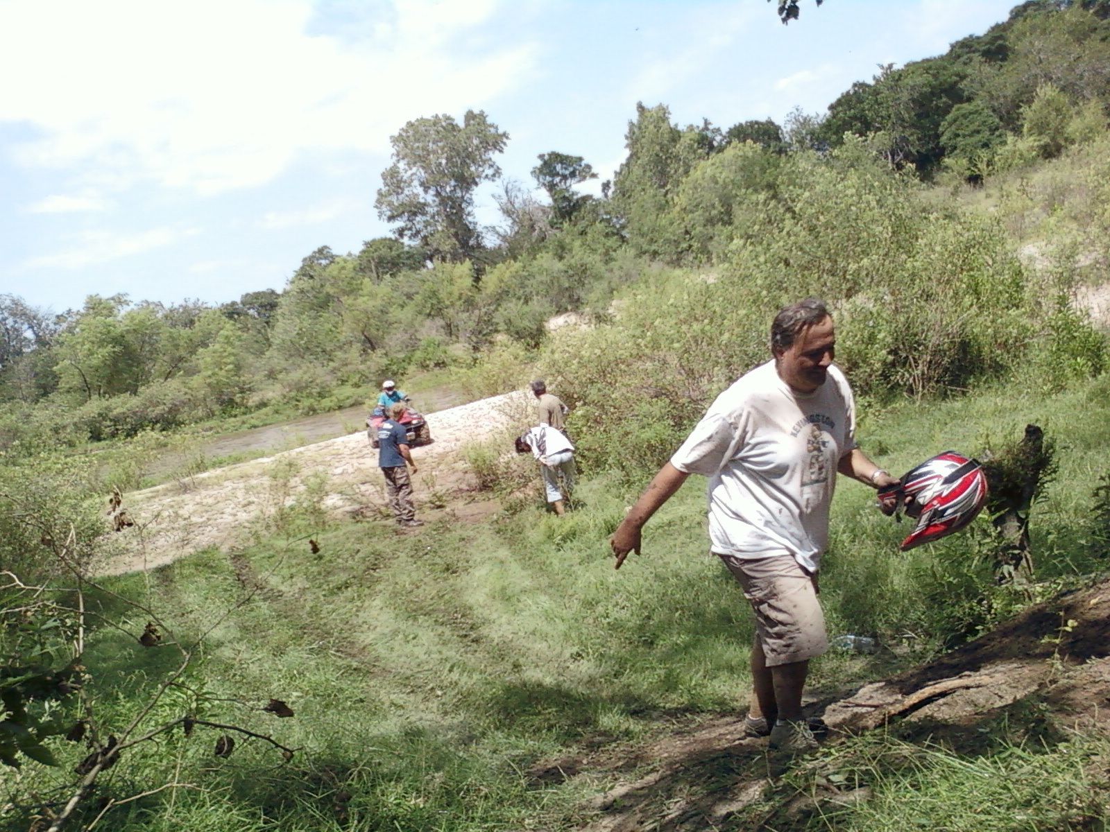 Sendero peligroso, de lo bien que íbamos, entre un huella y un desnivel muy pronunciado desaparecimos del camino y aterrizamos con éxito en los matorrales, que momento,  no nos dimos vuelta ni nada por el estilo, la rueda delantera izq. se levanto y cuando bajó el piso estaba mas abajo de lo pensado, en ese momento acelere para continuar con la inercia y descendimos al borde del río, lo mas lindo era ver bajar a todos los demás, creo que fue la mejor prueba de la tarde.