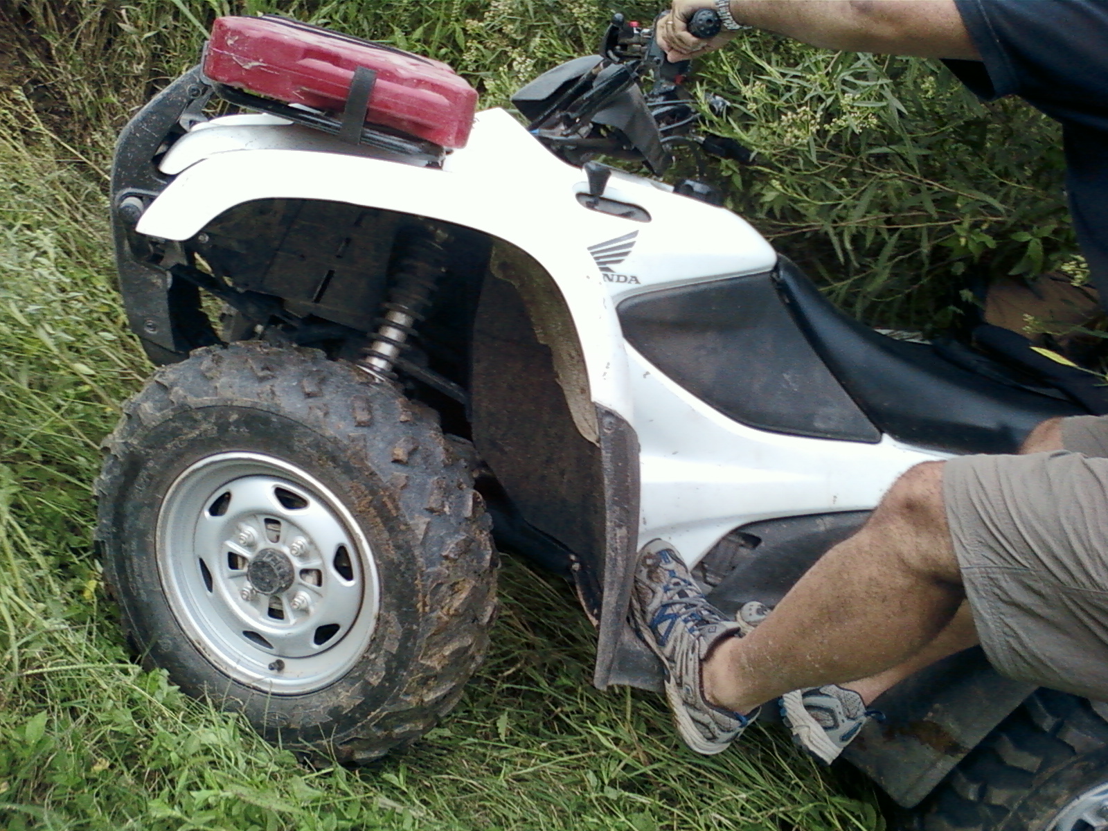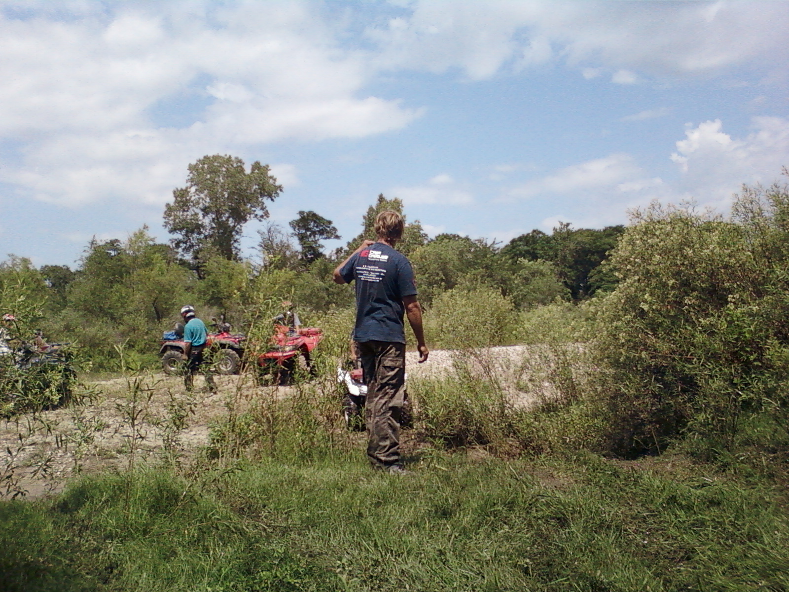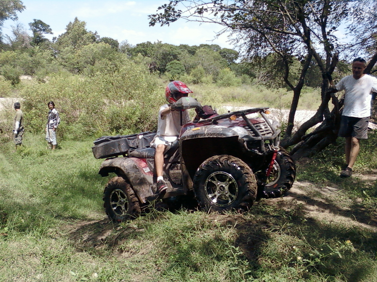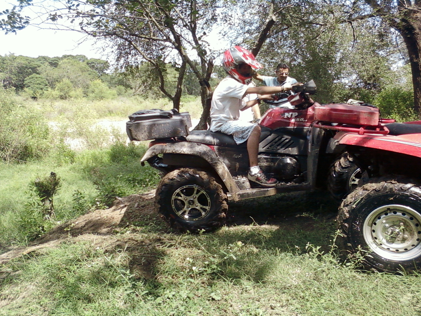 Sendero peligroso, de lo bien que íbamos, entre un huella y un desnivel muy pronunciado desaparecimos del camino y aterrizamos con éxito en los matorrales, que momento,  no nos dimos vuelta ni nada por el estilo, la rueda delantera izq. se levanto y cuando bajó el piso estaba mas abajo de lo pensado, en ese momento acelere para continuar con la inercia y descendimos al borde del río, lo mas lindo era ver bajar a todos los demás, creo que fue la mejor prueba de la tarde.