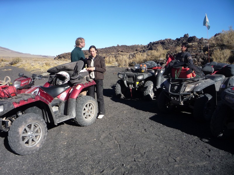 Se hizo presente la Negra con un paisaje recubierto de carboncillo, un lugar inimaginable en donde las palabras no alcanzan para describir lo exótico del lugar, el colado basaltico del volcán El Morado, la imagen de fondo del Payun Matru y el Liso, el campo de bombas piroclasticas y los innumerables volcanes con sus diferentes formas. Por ultimo La Pasarela, originada por la erosión del agua, a lo largo del tiempo, sobre el colado volcánico .